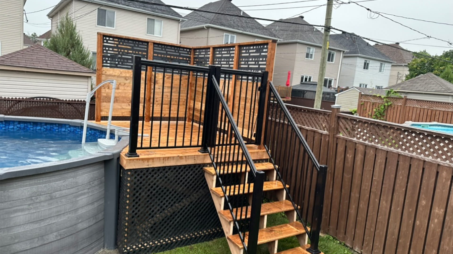 Patio d’accès piscine en bois traité, Rampe en aluminium